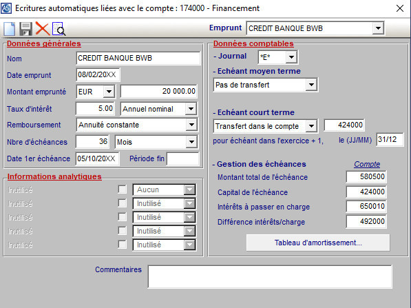 Pour visualiser le tableau d'emprunt, entrer dans le menu "Fiches" "Comptes généraux", entrer ensuite dans le détail du compte et cliquer sur "Ecritures automatiques"
